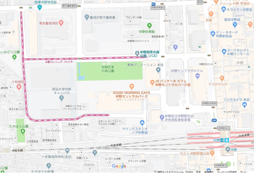 本日のランチは中野駅北口へ遠征してその帰り道!明日3月18日に、中野駅北口エリア【中野四季の森公園】及び周辺道路にて、【中野ランニングフェスタ】が開催されるようです!地図上のピンクのラインが引いてあるところが、コースの様です!